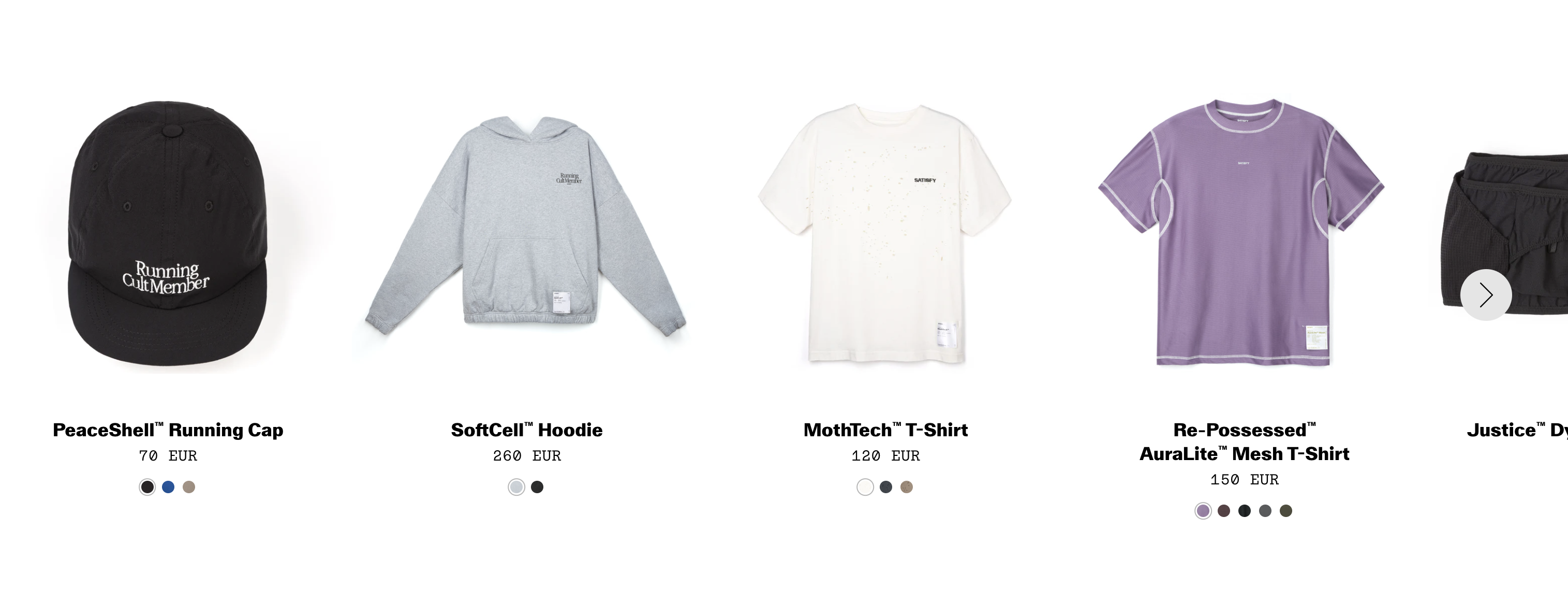 Satisfy는 자체 개발한 소재를 활용하여 제품을 제작합니다. 예를 들어, MothTech™는 통기성을 높이기 위해 의도적으로 작은 구멍을 낸 티셔츠이며, PeaceShell™은 가볍고 방풍 기능이 뛰어난 소재로 제작된 재킷입니다. 또한, CloudMerino™는 세계에서 가장 얇은 메리노 울을 사용하여 뛰어난 체온 조절 기능을 제공합니다.
